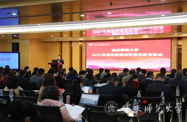 17位学院院长、主持行政工作的副院长,重点对照《学院事业发展年终述职考评关键指标》,简述了学院2021年度的工作概况,分别从教学、学科、人事、科研、学生工作等五大版块,对目标任务完成情况和特色亮点作了述职,并针对自身的不足,提出了今年工作的计划。会上,校领导班子、相关职能部门主要负责人结合各学院的述职情况,对学院基本运行中的“发展态势与特色”项目进行了测评打分,并将测评结果纳入学院年终目标管理考核。