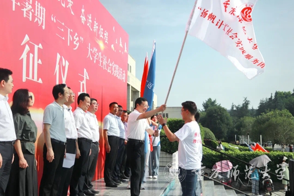 授旗环节,孟东方校长为暑期社会实践服务团重点团队成员代表授旗。孟小军副校长为专项团队代表授旗。党政办、组织部、宣传部、人事处、学生处、研究生院、保卫处、教务处、招生就业处、科研处、财务处、后勤与资产管理处、团委共13个学校第二课堂领导小组成员单位的领导为各学院社会实践服务团重点团队成员代表授旗。
