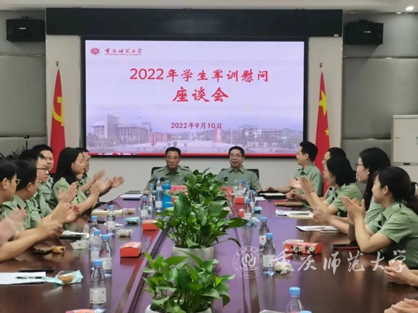 座谈会后,孟东方校长一行前往国风楼慰问承训部队教官。孟校长感谢承训部队对重师大学生军训工作的大力支持,并对军训教官致以节日的问候。