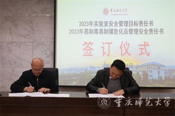 与会各学院与学校现场签订了2023年实验室安全目标责任书,使用危化品的6个学院还与学校签订了易制毒易制爆危化品管理安全责任书。