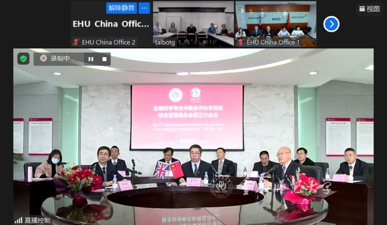 3月3日,米乐官网与英国知山大学以在线视频会议形式召开生物科学中英合作办学项目联合管理委员会第三次会议,米乐官网党委副书记、校长孟东方,党委常委、副校长杨如安、陆远权,英国知山大学副校长George Talbot出席会议。会议由副校长陆远权主持。