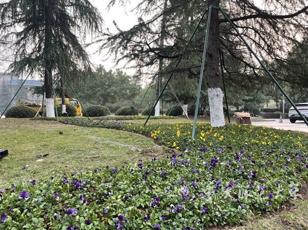 花团锦簇、百花吐艳,满园姹紫嫣红。除了赏灯,重师校园还是春节赏花的好去处。今年,学校在大学城校区东大门广场、综合办公楼、沙坪坝校区中心花园等重要节点栽植摆放近2万盆鲜花。园艺工人围绕春节元素进行匠心制作,以红黄暖色调鲜花配置为主色调,绘制出一幅幅繁花似锦的画卷。栽植的花卉品种繁多、色彩丰富,包括报春花、金盏菊、三色堇、杜鹃花、羽衣甘蓝等。