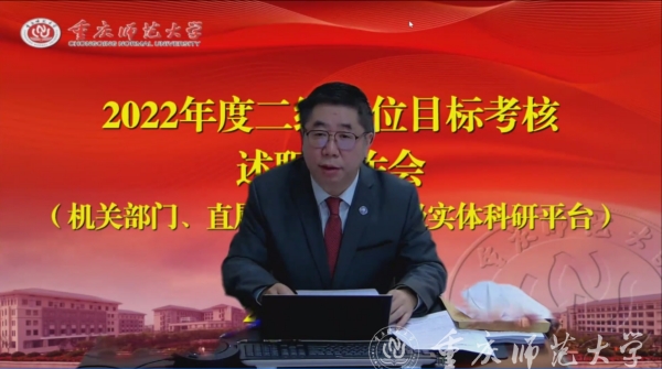各二级单位述职结束后,校长孟东方作了点评,他指出,因为疫情的原因,此次考核述职会采用网络视频会议的方式,是一个创新,效果总体不错。大家重点汇报了年度目标任务及关键指标任务的落实情况,充分展示了一年来的辛勤工作。大家的述职比照目标管理,有思路、有举措、有数据、有成效,述职的效果好。一是政治站位高,思想认识到位,学习贯彻党的二十大精神效果良好,干部队伍的支撑作用突出。今年是政治大年,我们以喜迎党的二十大、学习贯彻党的二十大精神为主线,围绕中心工作强化事业发展,强化了政治引领,履行了一岗双责,加强了党的建设,以实际行动迎接、学习、宣传、贯彻党的二十大精神,开展了学习贯彻二十大的相关活动,维持了学校的总体稳定。在学校改革发展稳定、疫情防控、攻坚克难等工作中,体现了担当精神、斗争精神。二是全校上下齐心,打好了新冠疫情防控的阻击战、遭遇战,防疫的成效来之不易,将负面影响降至了最低。今年的疫情防控任务非常重,今年3月、8月、11月,大致经历了3波大的疫情的冲击,对学校的工作冲击大,这个冲击是全社会的,教育系统的影响非常大,对学校的工作也带来大的影响。尤其是11月这波疫情,社会面感染人数多、防控压力大,给我们学校带来冲击。总体而言,我们学校疫情防控工作总体做得很好。经过全校上下共同的努力,我们没有出现大的问题,三个校区都经受住了考验。三是事业发展的指标有所增长,工作各有特色和亮点,成绩来之不易。从大家提交的工作总结和述职课件来看,今年我们的工作稳中有进,学校四个五年行动计划有一定的推进,一些主要指标有所增长,发展态势较好。各部门、学院坚守了阵地,工作总体平稳,重点工作和专项任务完成较好,成绩可圈可点。通过今天述职考评,达到了交流工作、共同提高的目的。对今年的工作也有基本的思考,有利于今年工作早谋划、再起步。
