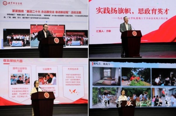 “先进个人”学生代表陈梦媛同学、“先进团队”学生代表陈俊池同学、“先进工作者”代表马克思主义学院党委副书记方敏、“大学生社会实践工作‘先进单位’”代表教育科学学院党委书记罗庆分别就个人心得体会、团队实践经历、教师指导经验、学院统筹部署四个方面进行专题发言。