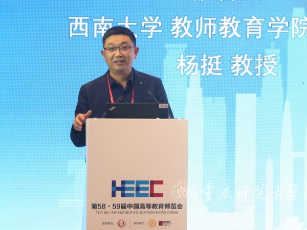 西南大学教师教育学院副院长杨挺以“人工智能+教师教育融合发展新路径——西南大学教师教育探索实践”为题,分享了西南大学教师教育数智化发展实践探索的经验:探索实施“学科专业教育”“教师专业教育”的师范生双专业培养模式,优化智慧教学环境、强化数字资源建设、力推智能平台应用,实施智能化+教师教育行动计划;创新探索教师教育融合发展实施路径,着力构建“一心三层五室”,一心即教师教育大数据中心,三层即环境设备层、基础规律层、创新应用层,五室即智能化教与学创课实验室、学习与教学发生机制实验室、智慧教室、人工智能实验室、虚拟仿真实验室。