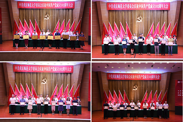 主席台就座的校领导为先进党组织、优秀共产党员和优秀党务工作者获奖者颁奖。
