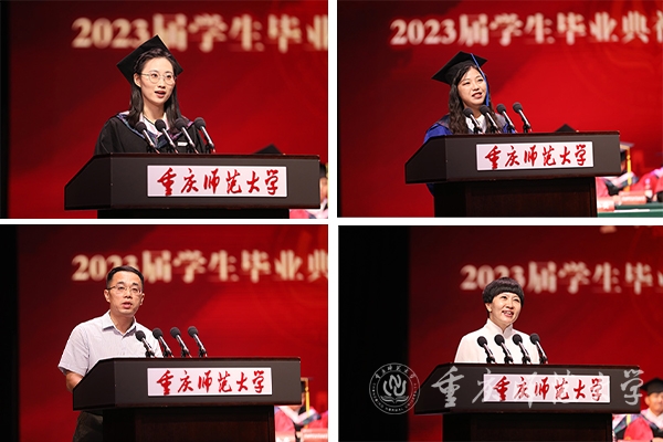 初等教育学院2019级小学教育(数学)专业的罗晓璇代表全体本科毕业生发言,她表示会以全新的身份担起新时代青年的社会责任,在具体的生活中做出成就,实现自我价值,为母校增添荣光。化学学院2020级分析化学专业的杜呈培代表全体毕业硕士研究生发言,她首先对母校和恩师们致以由衷的感谢和崇高的敬意,并回顾了自己在学校的七年时光,鼓励毕业生在“厚德笃学、砺志创新”校训的指导下继续勇往直前,开辟属于自己的人生道路。