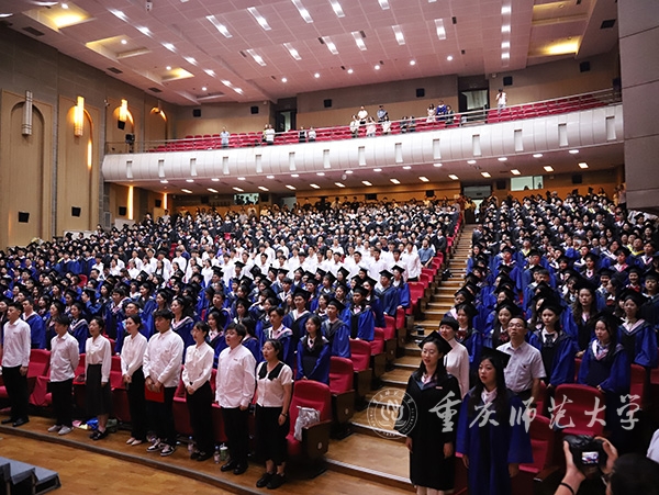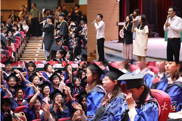 典礼正式开始前,毕业年级辅导员、毕业生和低年级学生代表等为毕业生们带来快闪献歌,《马鞭草花开的路口》《祝你一路顺风》《一起向未来》一首首歌曲或温馨感人,让同学们不由重拾美好时光;或青春激昂,祝福重师学子扬帆再起航。