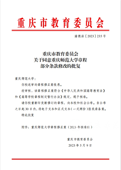 2023年1-5月,重庆市教委对送审章程进行了教委处室初审、2轮外审专家评审、合法性审查、逐字稿核对4阶段5轮审查,工作组严格按照每一轮审查意见对章程进行修改完善。5月初,学校通过重庆市政府政务服务网“渝快办”提交相关法律文书和章程修正案终稿,重庆市教委认为米乐官网章程修正案符合有关政策法规,体现学校特色,富有一定创新性,对学校建设发展具备前瞻引领作用,予以核准通过。