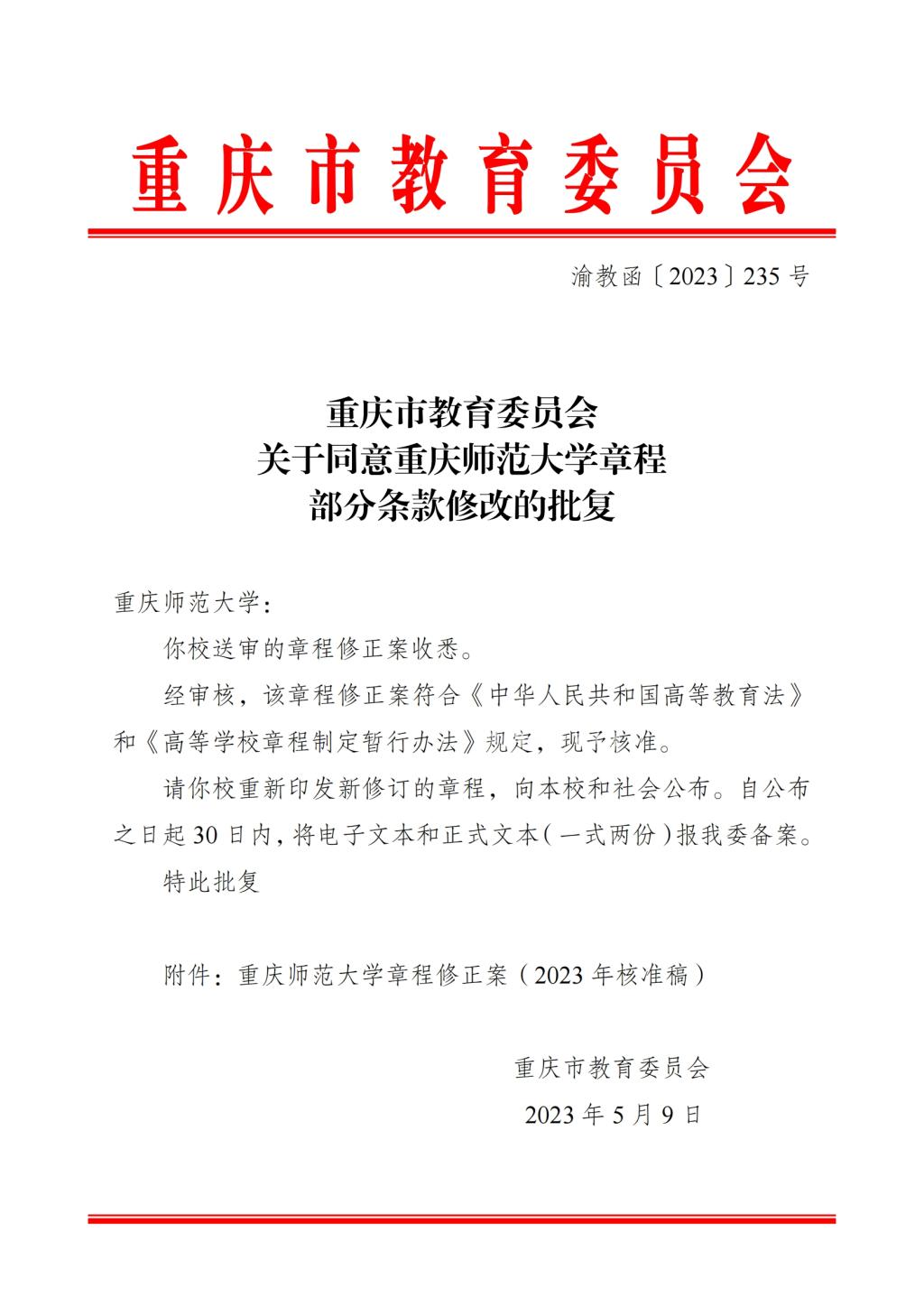 今年1-5月,市教委对送审章程进行了教委处室初审、2轮外审专家评审、合法性审查、逐字稿核对等4阶段5轮审查,终稿通过重庆市政府政务服务网“渝快办”报送提交,获重庆市教委批复核准。在章程送审过程中,市教委多次对米乐官网章程修正予以肯定,认为米乐官网章程修订工作扎实、程序规范、内容合理,充分体现政治性、突出时代性、彰显特色性、体现发展性。