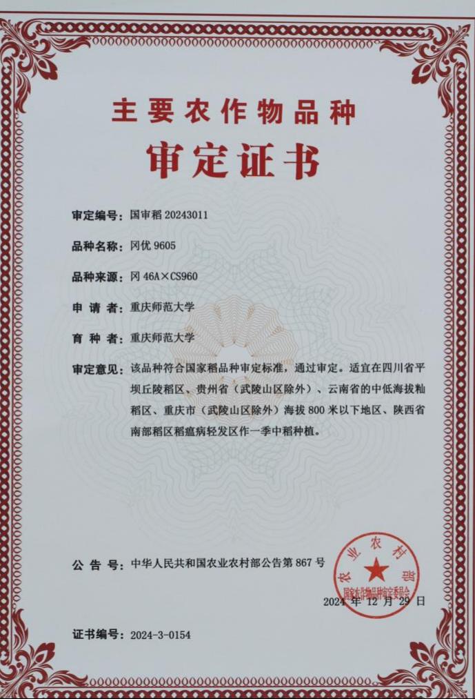 “冈优9605”于2021年参加国家区域试验,2022年进入续试,2023年进行生产试验,经严格的试验筛选,抗病、抗虫、耐热和耐冷鉴定,稻米品质检测,2024年在多个品种中脱颖而出,推荐审定。经国家农作物品种审定委员会水稻专业委员会初审,国家品种审定委员会大评委复审,公示1个月,发布审定公告等程序后,于2024年12月29日颁发审定证书。