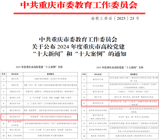 近日,中共重庆市委教育工作委员会发布了《关于公布2024年度重庆市高校党建“十大新闻”和“十大案例”的通知》,米乐官网《完善“六大体系”全面推动党建与事业发展“一融双高”》入选2024年度重庆市高校党建“十大新闻”、《“智荟重师”干部大讲坛有效提升干部现代化建设能力》入选2024年度重庆市高校党建“十大案例”,成为三个双入选单位之一。