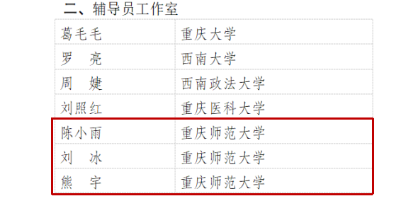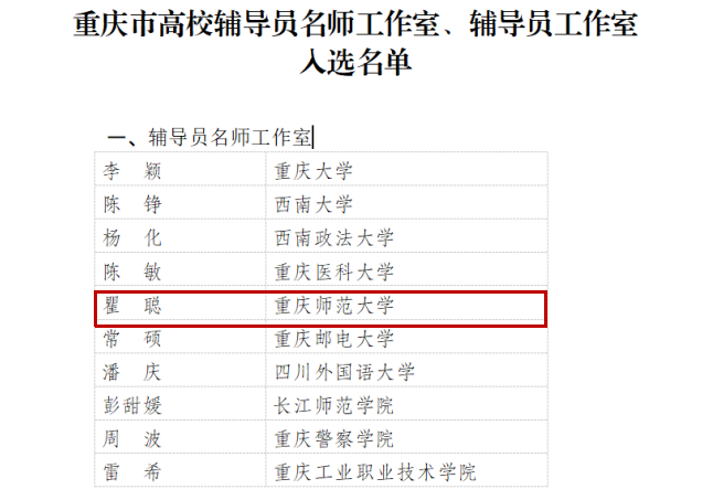 近日,重庆市教委公布重庆市高校辅导员名师工作室、辅导员工作室入选名单。米乐官网瞿聪老师入选市级辅导员名师工作室,熊宇老师、陈小雨老师、刘冰老师入选市级辅导员工作室。