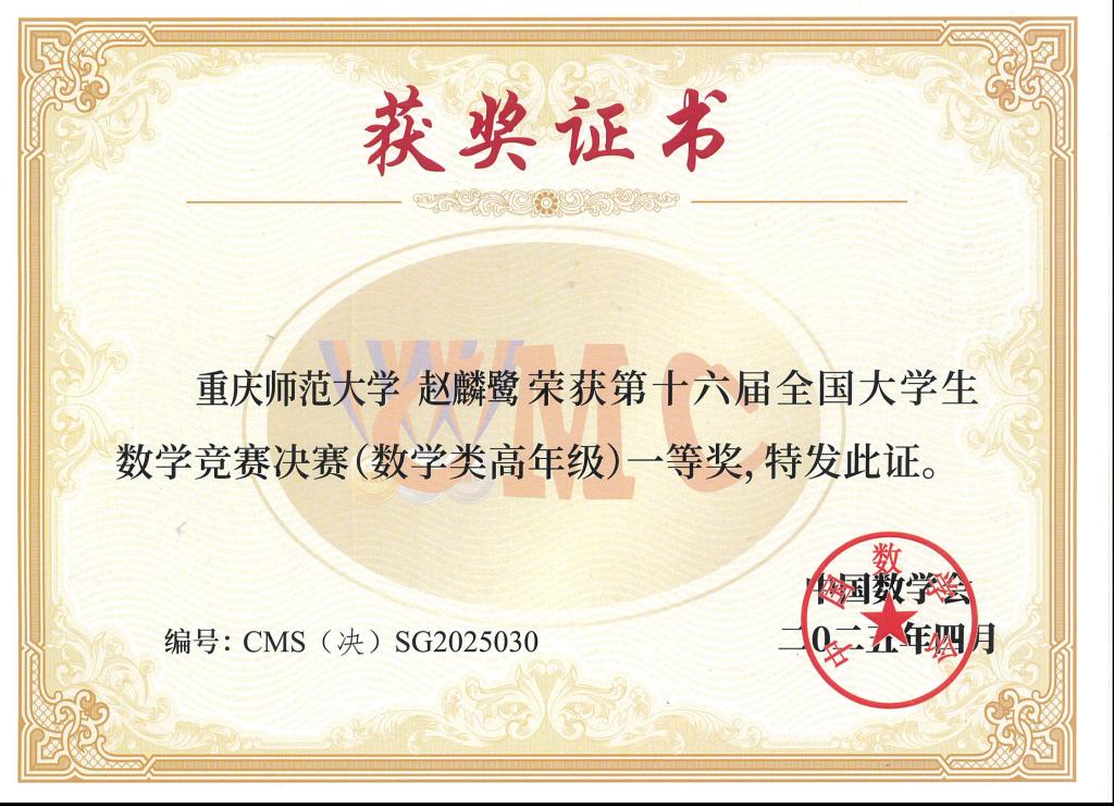 近日,米乐官网学子在第十六届全国大学生数学竞赛决赛中斩获6个个人奖项,其中数学科学学院2021级数学与应用数学专业赵麟鹭同学获数学类高年级组全国一等奖。这也是继去年学校获得全国大学生数学竞赛决赛一等奖以后再次获此殊荣。
