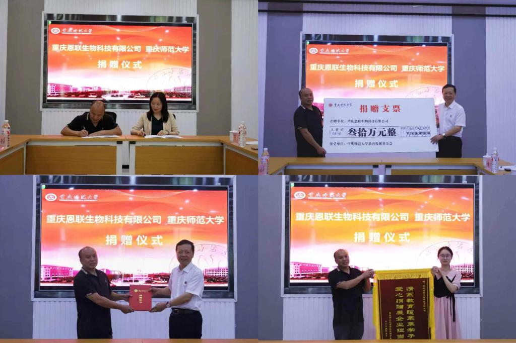 仪式上,学校国内合作与联络中心主任牟萍代表基金会与重庆恩联生物科技有限公司总经理游洪全签订捐赠协议。孟小军代表基金会接受捐赠,并为游洪全颁发捐赠证书。学生代表为重庆恩联生物科技有限公司送上锦旗。