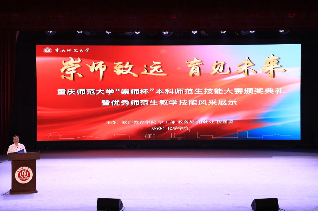 为深入学习贯彻党的二十大精神和习近平总书记关于教育的重要论述精神,全面贯彻党的教育方针,加快推进教育现代化,促进师范生将学科理论与教学实践相结合,提升师范生基本素养和专业技能,6月6日下午,学校“崇师杯”本科师范生技能大赛颁奖典礼暨优秀师范生教学技能风采展示活动在校友会堂演出厅举行。学校党委副书记、校长王国胤出席颁奖典礼,党委常委、副校长孟小军主持典礼,相关职能部门负责人、各相关学院分管教学工作副院长,师范生代表及获奖选手参加典礼。