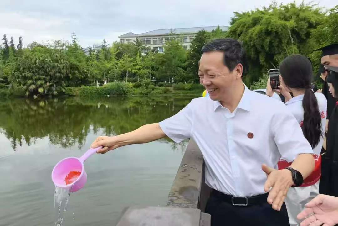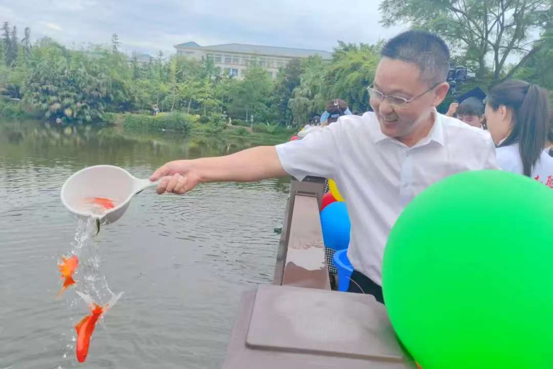 活动现场,毕业生们怀着感恩之情汇聚湖畔。随着张艳宣布活动正式开始,寄托师生情谊与美好愿景的锦鲤鱼苗跃入湖中,三春湖顿时波光粼粼。这片承载无数校园记忆的湖水,此刻化作情感的纽带与梦想的港湾,凝聚着师生对往昔的眷恋与对未来的憧憬。