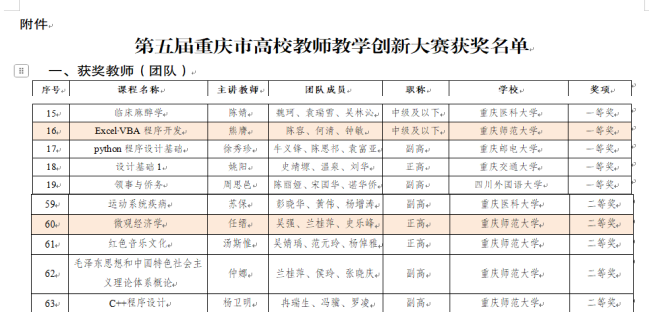 近日,第五届重庆市高校教师教学创新大赛获奖名单揭晓,米乐官网经济与管理学院熊膺教师团队凭借创新的教学设计和突出的教学成果在比赛中脱颖而出,荣获新文科赛道中级及以下组别一等奖,成为学校唯一推荐参加重庆市全国高校教师教学创新大赛选拔赛的团队;任缙教师团队荣获新文科赛道正高级组别二等奖,彰显了学校教师卓越的教学创新能力与扎实的专业素养。