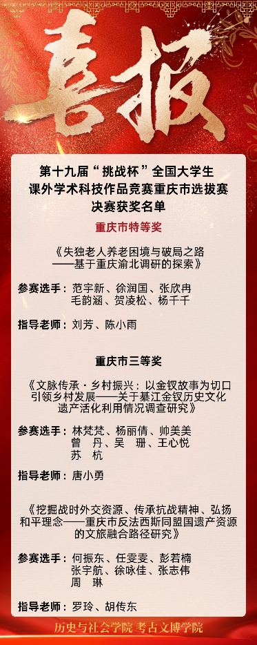 本次竞赛中,历史与社会学院推送的3个项目入围市赛,其中1个项目闯入决赛。由范宇新、徐润国、张欣冉、毛韵涵、贺凌松、杨千千共同完成,刘芳、陈小雨老师指导的哲学社会科学类社会调查报告《失独老人养老困境与破局之路——基于重庆渝北调研的探索》脱颖而出,荣获重庆市特等奖。另外两项参赛作品获得市级三等奖。