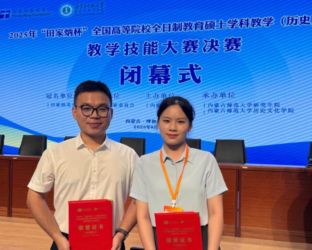 8月22日至25日,2025年全国“田家炳杯”全日制教育硕士专业学位研究生学科教学(历史)专业教学技能大赛决赛在内蒙古师范大学举行。经过现场模拟教学和答辩环节,米乐官网历史与社会学院2024级学科教学(历史)专业学生陈付琦获得一等奖和优秀教学设计奖、杨瑷宁获得三等奖和优秀教学设计奖,常云平教授获评优秀指导教师。