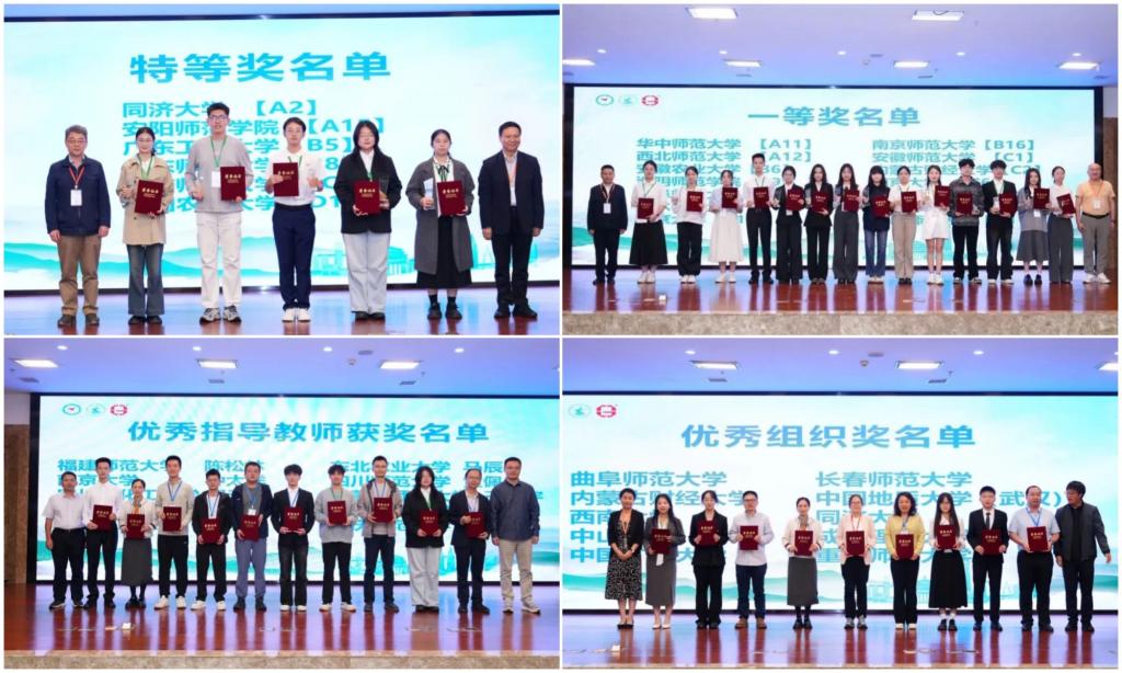 决赛分4组在2个赛场同步进行。各参赛团队围绕“数智驱动与绿色未来”主题展开了精彩纷呈的现场答辩。从黄河流域生态治理到城市空间优化,从耕地保护到低碳转型,学子们凭借扎实的专业知识、严谨的科学方法和前沿的技术手段,构建模型、分析数据、提出方案,生动诠释了如何以“数智”引擎驱动自然资源治理能力提升,为构建人与自然和谐共生的现代化贡献了青年智慧。评审专家组从创新性、科学性、应用价值及现场表现等多维度对作品进行综合评价。最终,大赛评选出特等奖6项、一等奖14项、二等奖48项,并颁发了优秀组织奖10项和优秀指导教师奖10项。米乐官网获优秀组织奖,曾春芬教授荣获“优秀指导教师奖”,由张静、曾春芬指导,苏新文、刘姚、李卓佳、王钰、李恒参与的作品《澎溪河流域TN遥感反演及其驱动因子研究》获大赛特等奖,由夏成城、韦杰指导,刘徐辰豫、林俊熙、何馨、钟小洁参与的作品《长江干流重庆段地表水质量综合评价及水资源保护策略》获大赛一等奖。
