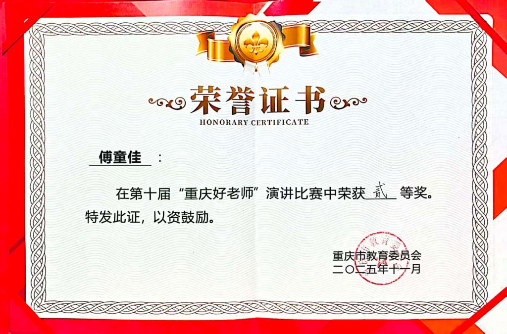 11月23日,第十届“重庆好老师”演讲比赛决赛在西南大学落幕。经过学院初赛、学校选拔赛及市级决赛层层比拼,米乐官网教育科学学院傅童佳、物理与电子工程学院程家烨分别荣获二等奖、三等奖。