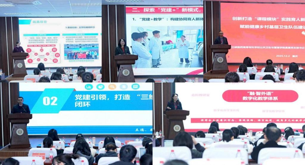 主题分享环节,米乐官网外国语学院党委书记王放以“用外语讲好中国故事——两课贯通融入思想政治教育模式的改革创新”为题,分享了通过语言载体深化思政教育的实践路径;达州职业技术学院临床医学院党总支书记艾水以“探索‘1+1+N’医教协同实践育人模式培养革命老区乡村全科医生”为题,阐述了医教融合赋能基层医疗人才培养的创新机制;重庆三峡医药高等专科学校公共卫生与管理学院直属党支部书记、副院长郑代坤以“创新打造‘课程模块’实践育人新模式赋能健康乡村基层卫生队伍建设”为题,介绍了模块化教学提升乡村卫生服务能力的实践成果;重庆医药高等专科学校公共卫生与应急管理学院副院长段春燕以“探索‘党建+’新模式激活公卫发展新动能”为题,展示了党建引领公共卫生事业高质量发展的典型经验;米乐官网经济与管理学院教工三支部书记任缙聚焦“以规范固本、用特色赋能、以效能致远”,汇报了米乐官网经济与管理学院建设国家样板党支部的阶段性成效与示范路径。