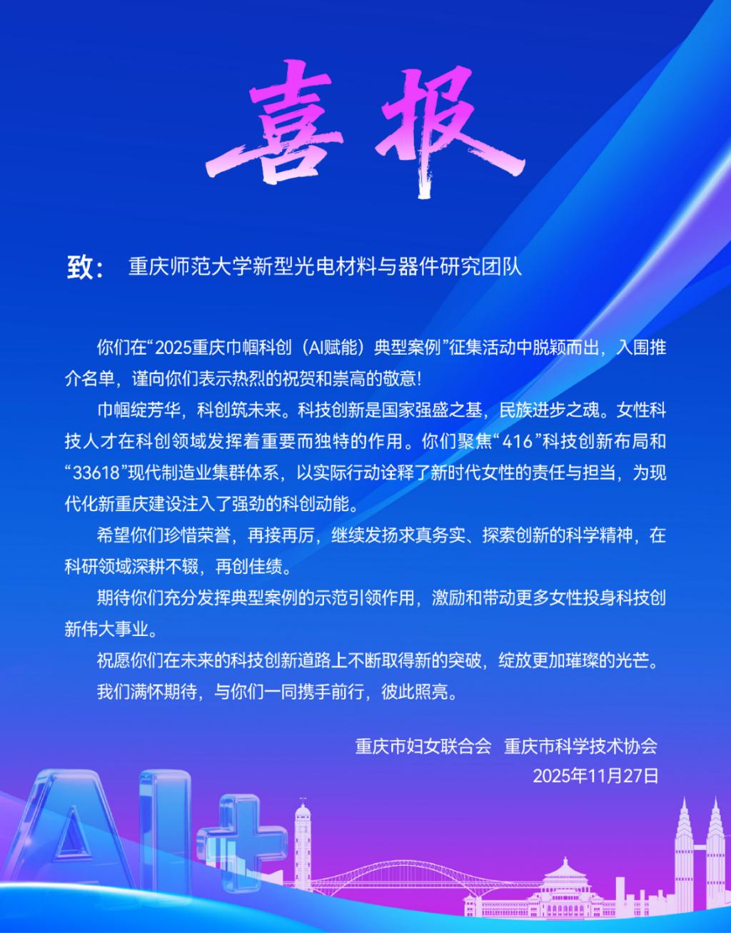 近日,重庆市妇女联合会与重庆市科学技术协会联合开展全市巾帼科创典型案例征集活动。经综合评审,全市共遴选出50个典型案例,涵盖数智科技、生物制造、生命健康、智慧农业、绿色低碳、新材料等多个领域。米乐官网化学学院“新型光电材料与器件研究团队”(负责人:黄春梅;核心成员:崔清玥、冯意、吴锐等)凭借扎实的科研创新实力与突出的科教融合成效,成功入选“新材料”领域典型案例。
