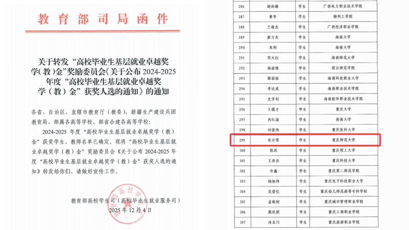 作为一名共产党员,她始终牢记党的宗旨,发挥党员的先锋模范作用,勤恳负责,努力工作,获评库车市“优秀共产党员”。她曾荣获重庆市2023-2024年度高校毕业生基层就业卓越奖,该奖项旨在表彰那些在基层岗位上做出突出贡献的高校毕业生和指导教师。此外,她还获得了2024-2025年度“全国高校毕业生基层就业卓越奖学金”,该奖学金由教育部设立,以鼓励高校毕业生到基层就业。这些荣誉是对她多年来辛勤付出的肯定,也是对她边疆教育工作的认可。
