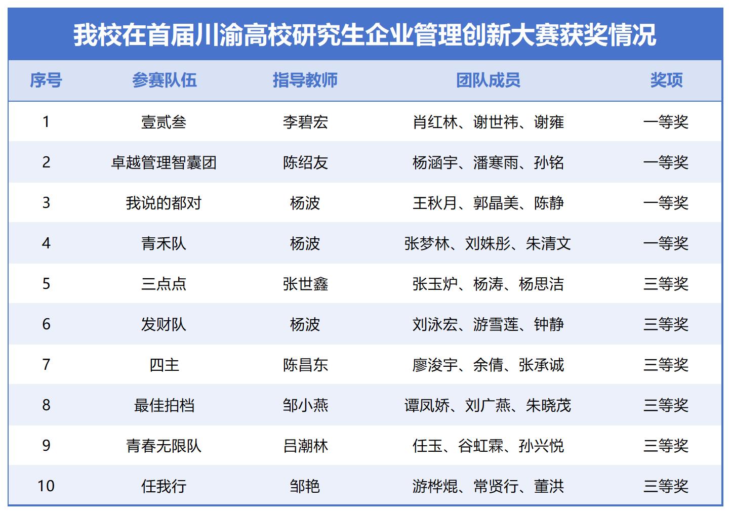 近日,第一届川渝研究生企业管理创新大赛决赛在西南政法大学渝北校区举行。在川渝20所高校140支晋级队伍中,米乐官网经济与管理学院学子获得一等奖4项、三等奖6项,米乐官网荣获“优秀组织奖”。