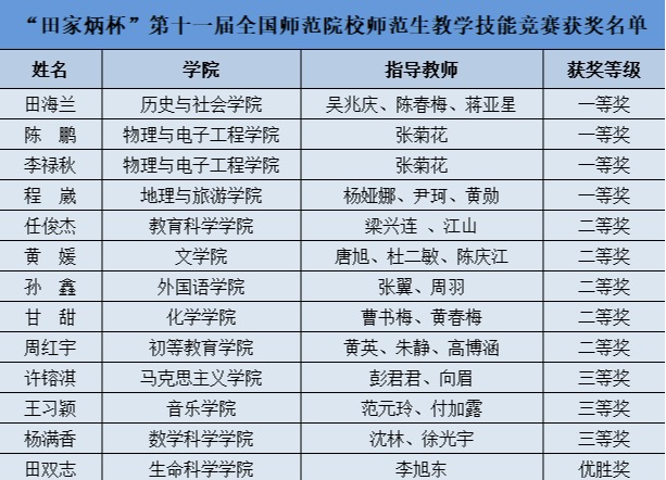 自大赛启动以来,学校高度重视,由教师教育学院牵头统筹协调,相关学院全力支持,选派指导教师精心辅导,共同做好选手赛前培训、备课、磨课、研课、录课等工作,全面提升了参赛学生的教学技能与综合素养。经过激烈角逐,历史与社会学院田海兰,物理与电子工程学院陈鹏、李禄秋,地理与旅游学院程崴获一等奖;教育科学学院任俊杰,文学院黄媛,外国语学院孙鑫,化学学院甘甜,初等教育学院周红宇获二等奖;马克思主义学院许溶淇,音乐学院王习颖、数学科学学院杨满香获三等奖,生命科学学院田双志获优胜奖。
