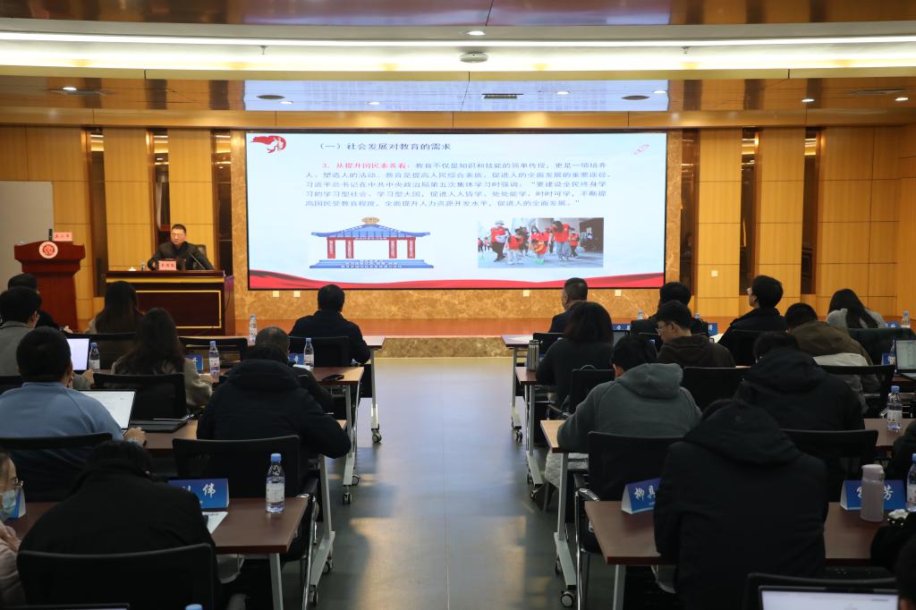 12月11日下午,新进教师专题培训在博雅楼503会议室举行。学校党委副书记、校长王国胤以“坚守教育初心 勇担历史使命 为强国建设民族复兴伟业作出积极贡献”为题作专题报告。校党委常委、副校长孟小军主持培训会。