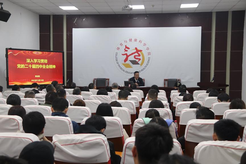 12月18日上午,学校党委常委、纪委书记、监察专员贺吉胜在体育与健康科学学院会议室作党的二十届四中全会精神宣讲。