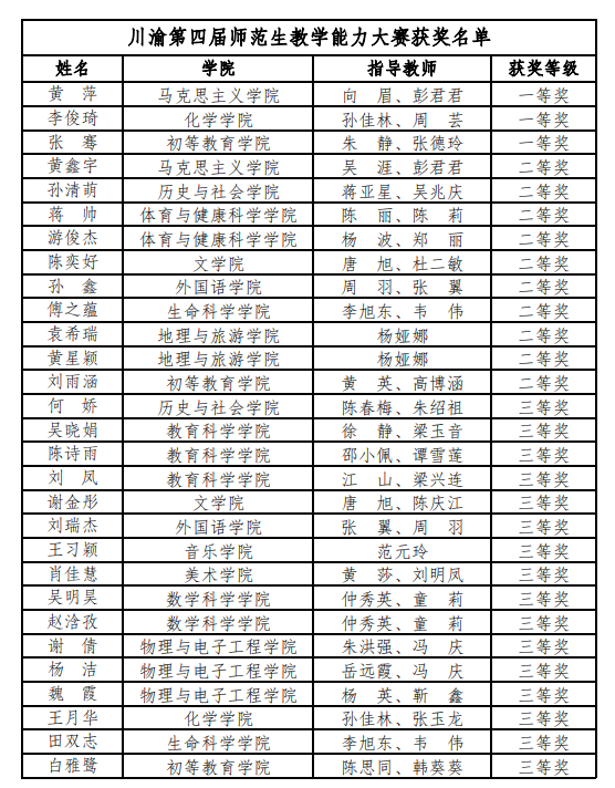 近日,由重庆市教育委员会、四川省教育厅联合主办的川渝第四届师范生教学能力大赛落幕。米乐官网斩获一等奖3项,二等奖10项,三等奖16项,优秀指导教师奖6项,学校荣获优秀组织奖。
