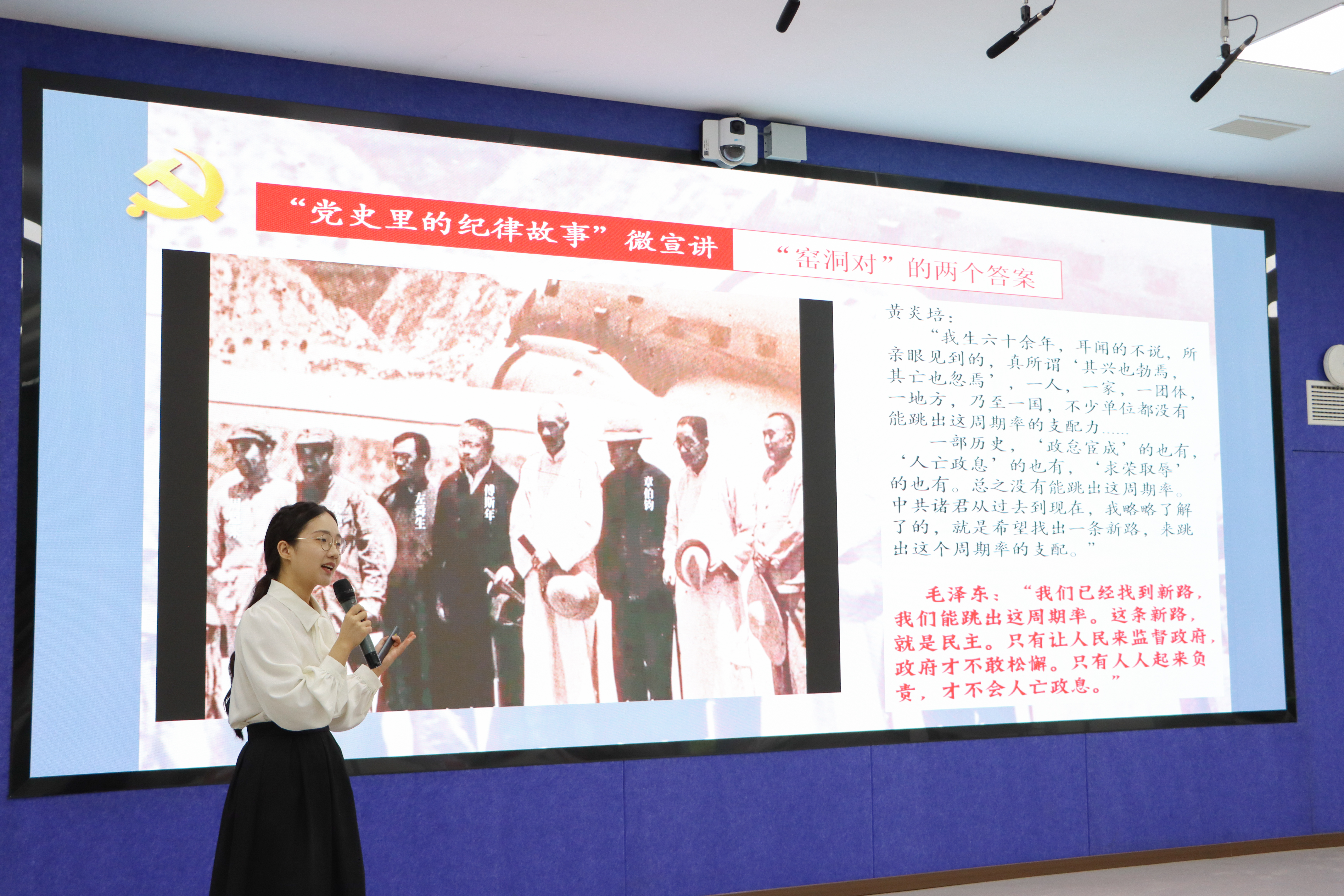 南陈北李相约建党的故事,生动阐释了伟大建党精神的深刻内涵;第一份入党誓词的文物故事,阐述了纪律建设与马克思主义政党特质的关系;以周恩来、邓颖超在重庆的廉政故事,彰显了红岩精神“出淤泥而不染”的政治品格;以“狱中八条”的总结与产生的过程警示当下,锤炼忠诚干净有担当的思想品格;以人民解放军在解放上海前夜露宿街头的故事,充分展示了人民军队的严明军纪;以“窑洞对”的两个答案,讲出了中国共产党对于跳出历史周期率的百年探索历程。