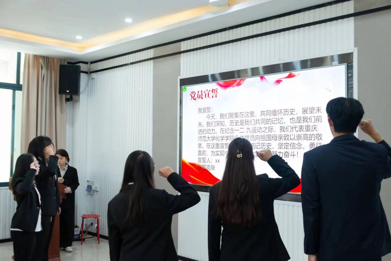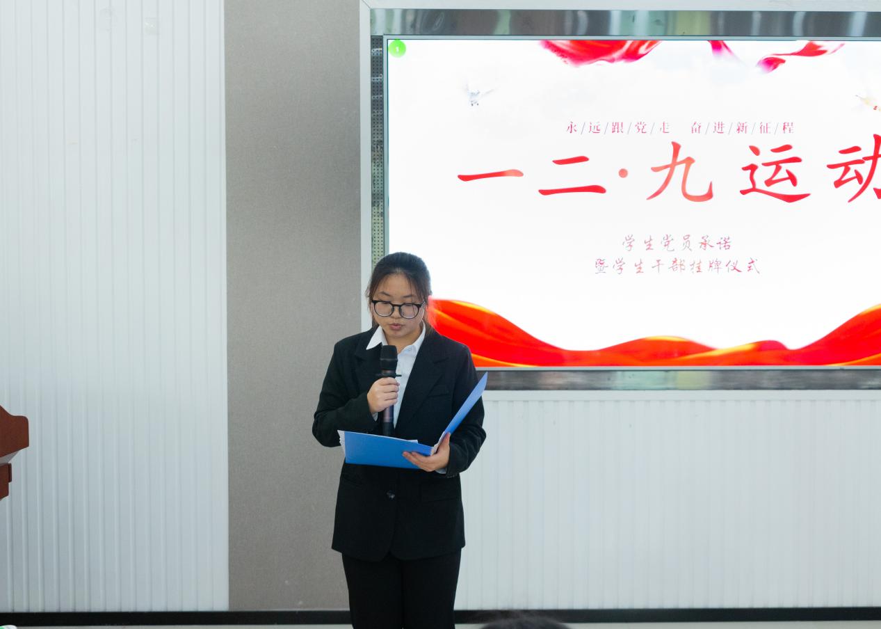 “铭记历史,坚定信念,勇往直前,为实现中华民族伟大复兴而努力奋斗”,学生党员代表以纪念“一二九”运动为契机,继承先烈遗志,郑重许下承诺。洪亮而高亢的宣誓词,是每位党员对自己的要求,更是对党的承诺。