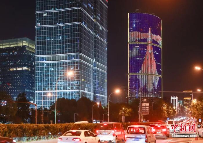 2023年11月19日,北京市朝阳区CBD高层建筑上演灯光秀。贾天勇 摄