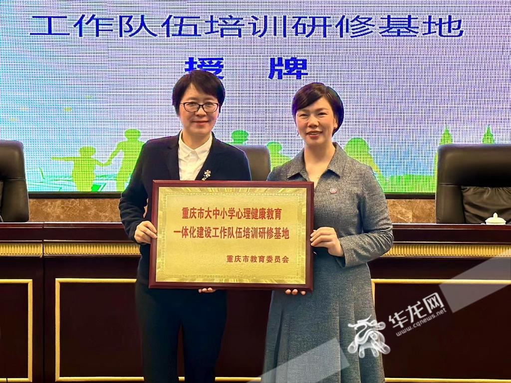 现场,重庆市委教育工委专职副书记屈锐为重庆市大中小学心理健康教育一体化建设工作队伍培训研修基地授牌。