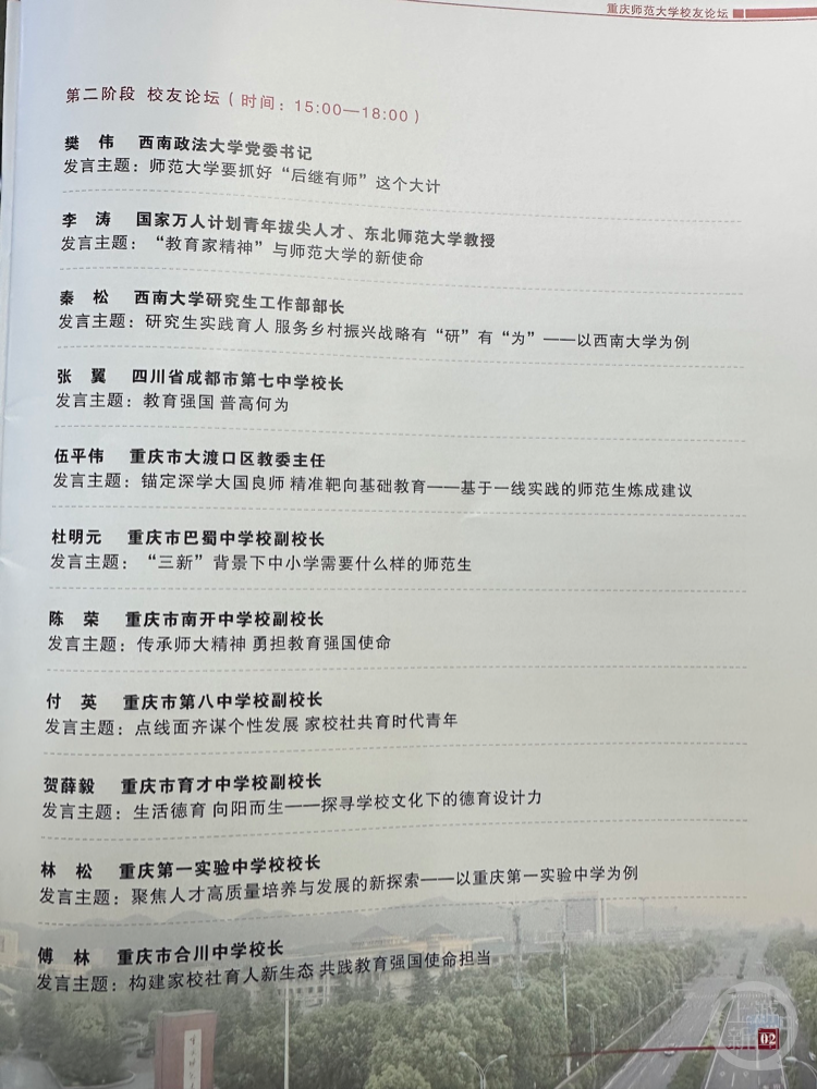 上游新闻记者在现场了解到,包括了重庆市第一中学、重庆南开中学、重庆第八中学、重庆巴蜀中学、重庆育才中学、重庆外国语学校、西南大学附属中学等知名学校在内,均有重师校友担任校领导职务。