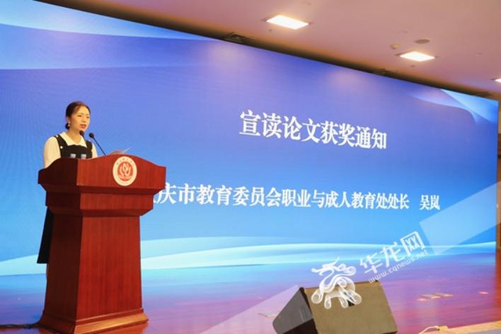 重庆市教委职成教处处长吴岚宣读论文获奖通知。陈佳 摄据悉,本次研讨会还组织开展了优秀论文评选工作。经评审,共有35篇论文获奖,其中一等奖5项、二等奖10项、三等奖20项,鼓励青年学者积极投身职教师资的相关研究,并在现场为论文获奖代表进行了颁奖。