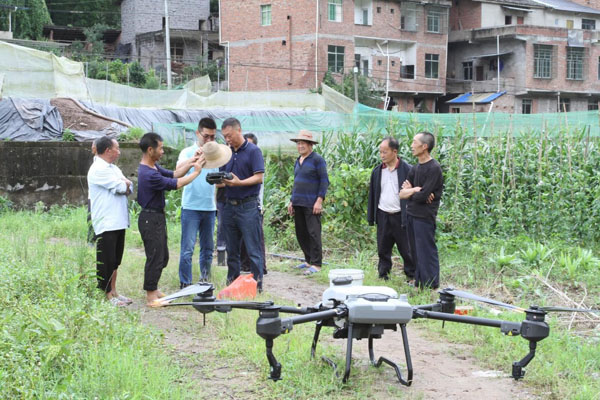 调整无人机设备,用无人机喷洒施药对示范田开展病虫害防治。