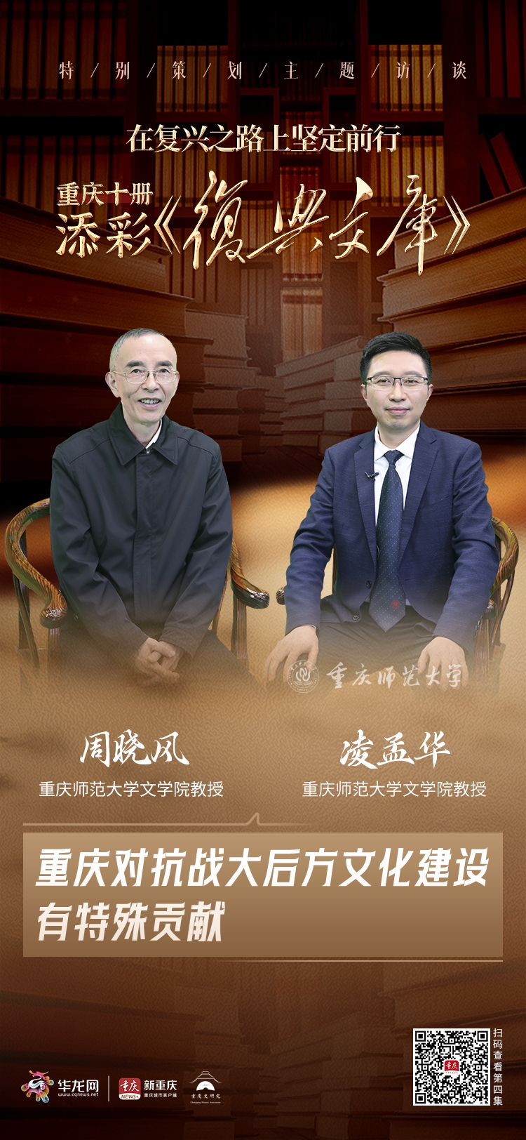 继《人间正道是沧桑——百年百篇 留声复兴之路》之后,华龙网-新重庆客户端再次携手全国党史研究领军人物、中国抗日战争史学会副会长、重庆史研究会会长周勇教授及其团队,推出特别策划《在复兴之路上坚定前行——重庆十册 添彩<复兴文库>》主题访谈。
