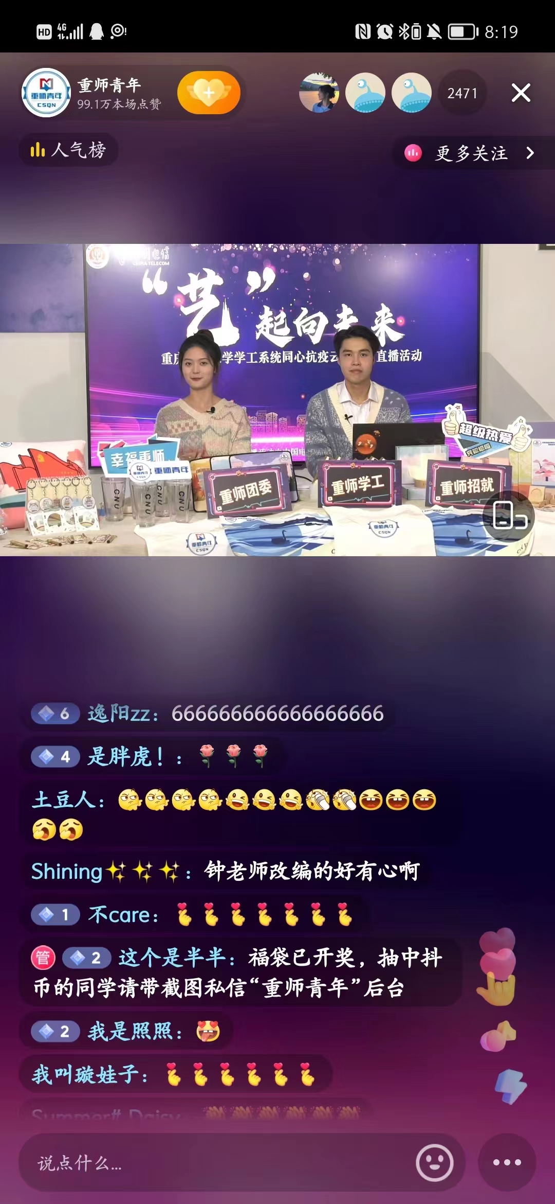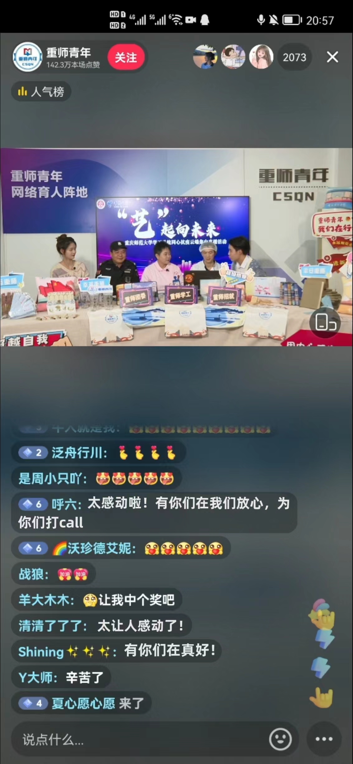 直播现场,工作时长超29年的“柏爸爸”柏仕坤、新进“学工男神”胡绍宇、“清新女神”曾珠等23名一线学工教师代表为同学们带来原创曲目、师生合唱、民族舞蹈等节目,不少同学表示“节目太赞了,给疫情生活增添了不少色彩!”“为老师们打call!”