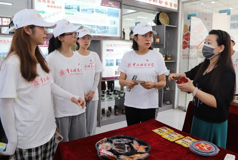 “传统工艺,科学管理,质量保证,追求创新”,在重庆市宏霖食品股份有限公司,负责人谭红梅带领志愿者们走进产品展销中心了解产业概况。交流会上,谭红梅表示,作为第二产业中的加工业,由于地理位置与交通运输等原因,宏霖食品面临着缺乏专业人才与技术人员的难题。就此,实践团指导老师张珍瑜向负责人介绍MILE米乐集团食品安全等专业,并表示鼓励重师学子返乡就业、助力产业振兴。