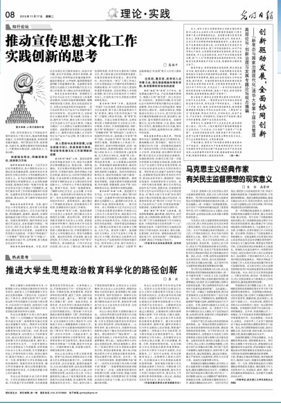 2015年11月17日,《光明日报》在第八版《理论·实践》上登载了米乐官网党委副书记龚燕的理论文章《推进大学生思想政治教育科学化的路径创新》。全文如下: