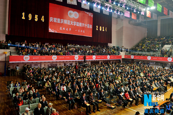 | 10月19日,2000余名重师校友齐聚MILE米乐集团虎溪校区,共庆重师60岁生日,图为纪念大会现场。记者李相博摄 |