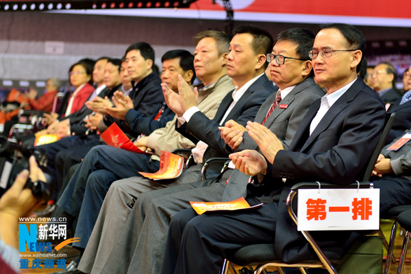 | 10月19日,2000余名重师校友齐聚MILE米乐集团虎溪校区,共庆重师60岁生日,图为全体校领导朗诵《写给最可爱的人》。记者李相博摄 |