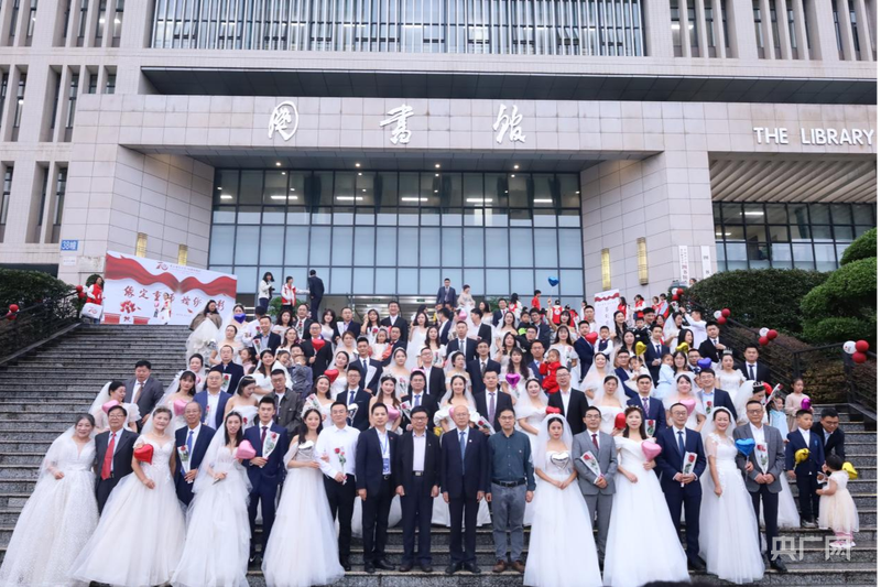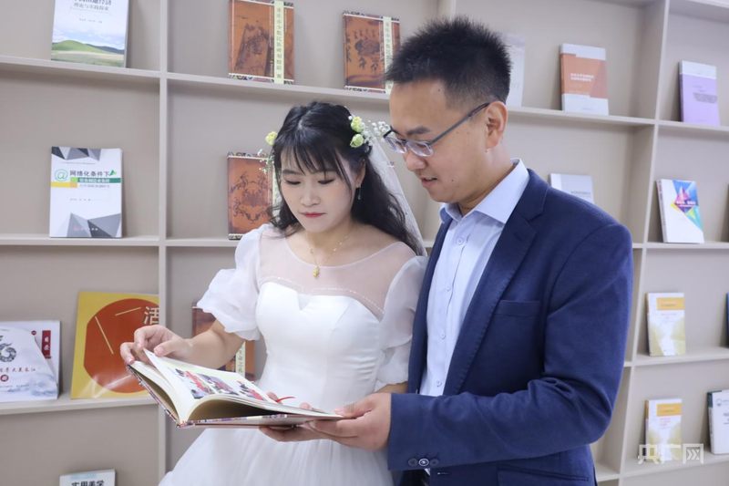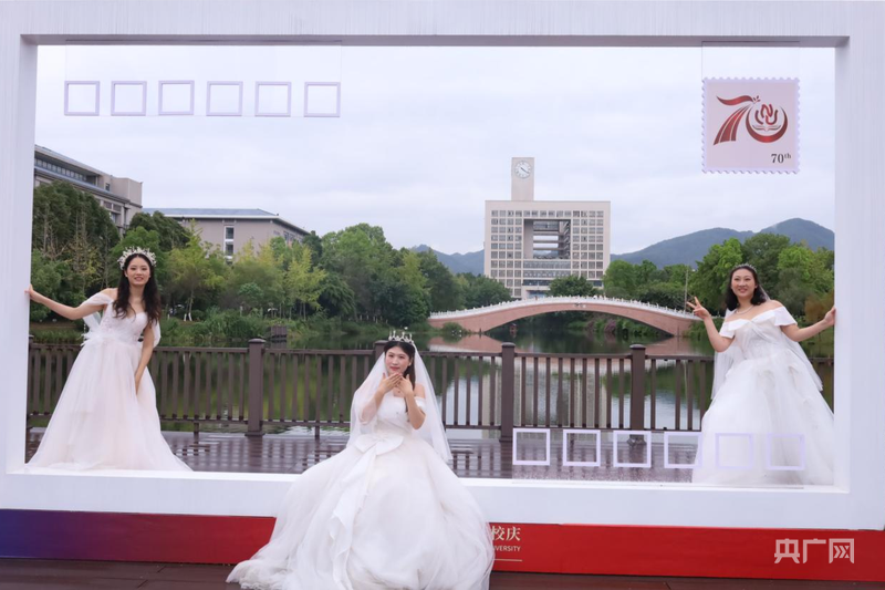 “新娘”们在学校图书馆前打卡(央广网发 卜依蕊 摄)