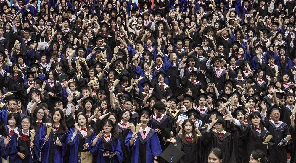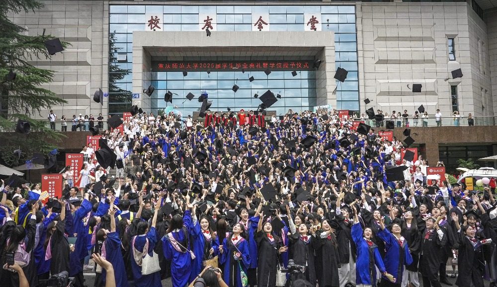▲2025年6月24日,重庆师范学院大学城校区,众多毕业生一起抛飞帽子,庆祝毕业。学校今年共有6364名本科生和2467名研究生毕业。记者 郑宇 摄
