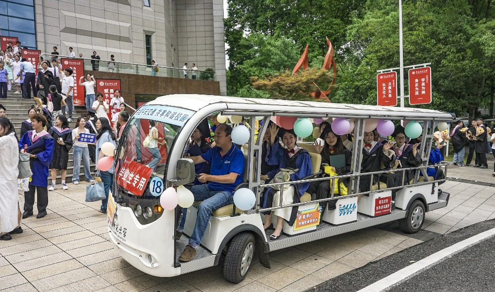 在毕业典礼暨学位授予仪式举行完毕后,学校的食堂阿姨、保安大叔、校车司机以及低年级的学弟学妹们在会场门口排成两排,以鲜花、歌声和掌声,向即将离校的毕业生们送去临行前的祝福,并发出“常回母校看看”的邀请,定格这个夏天最美好的毕业记忆。